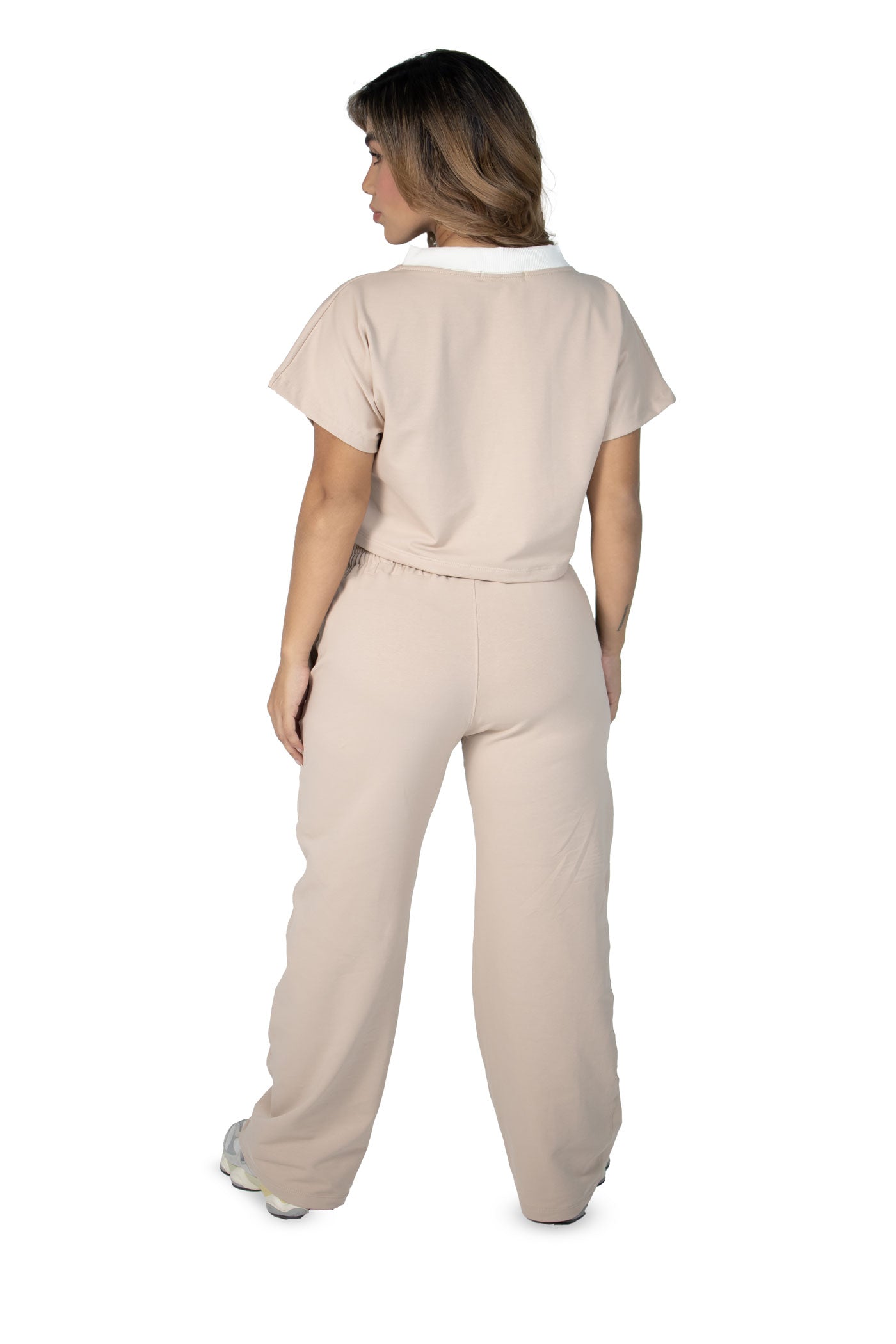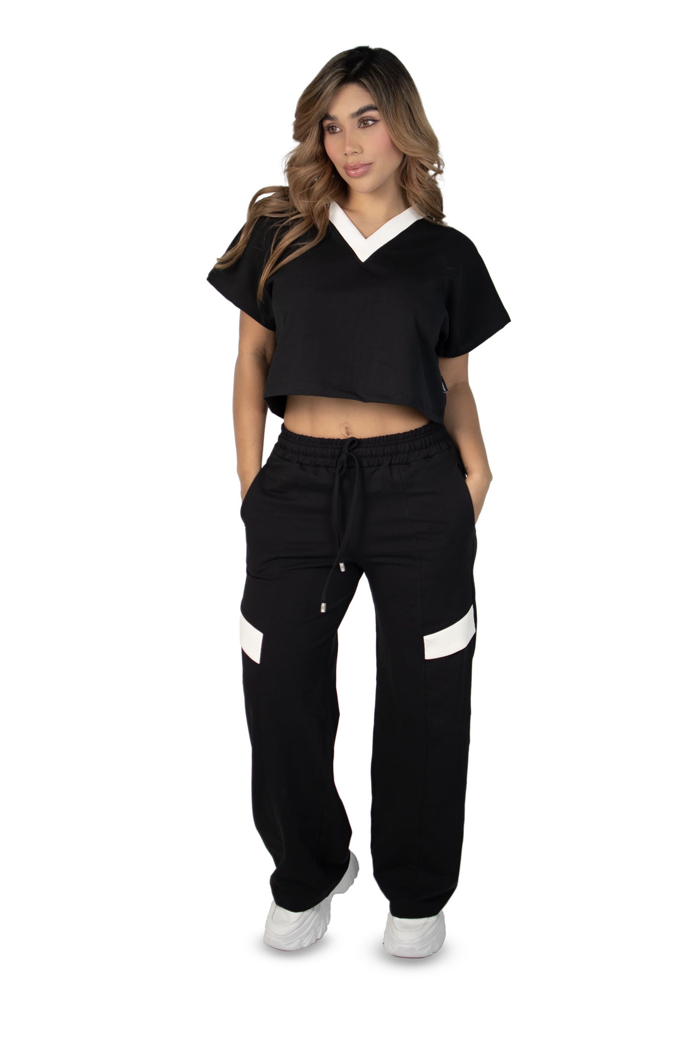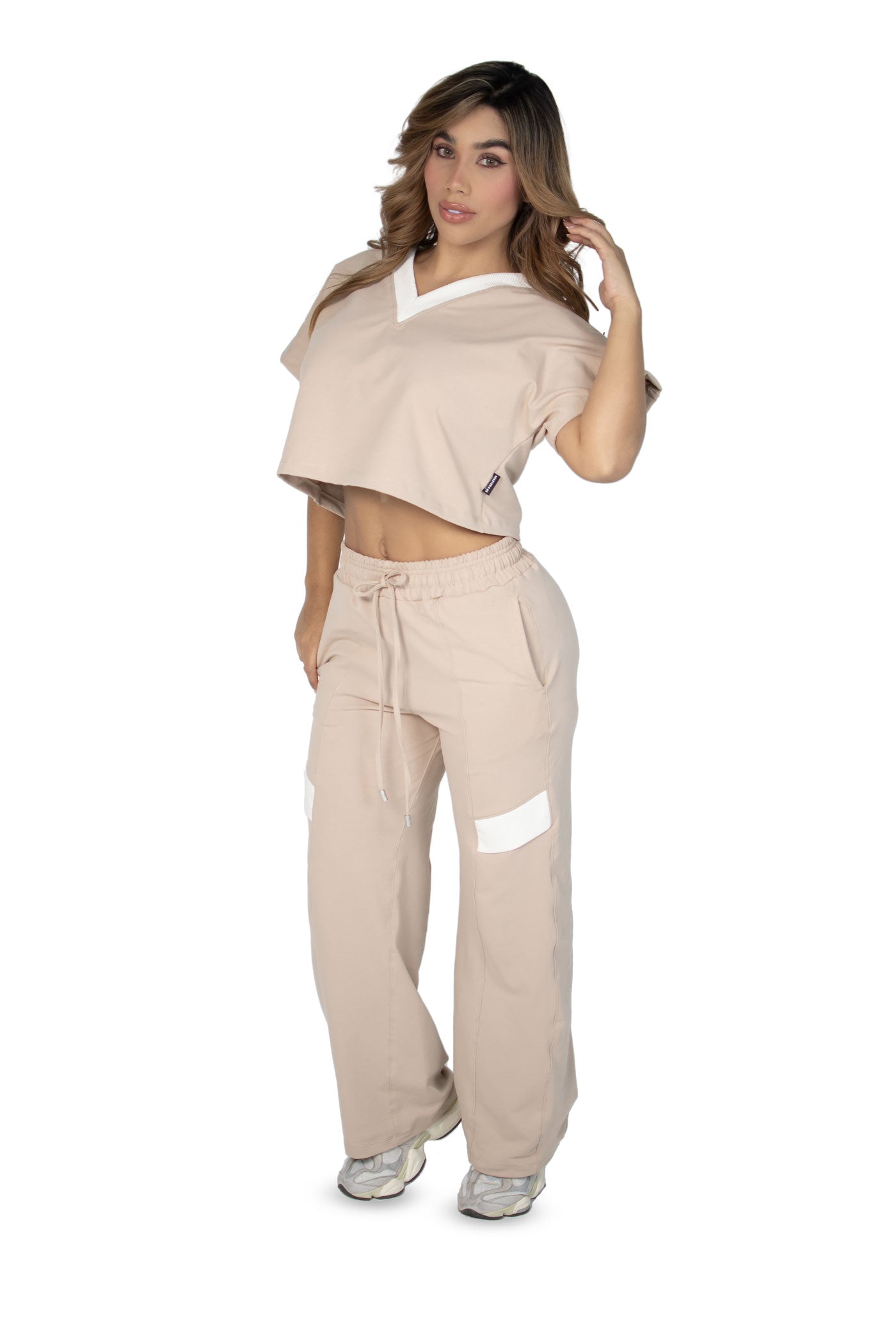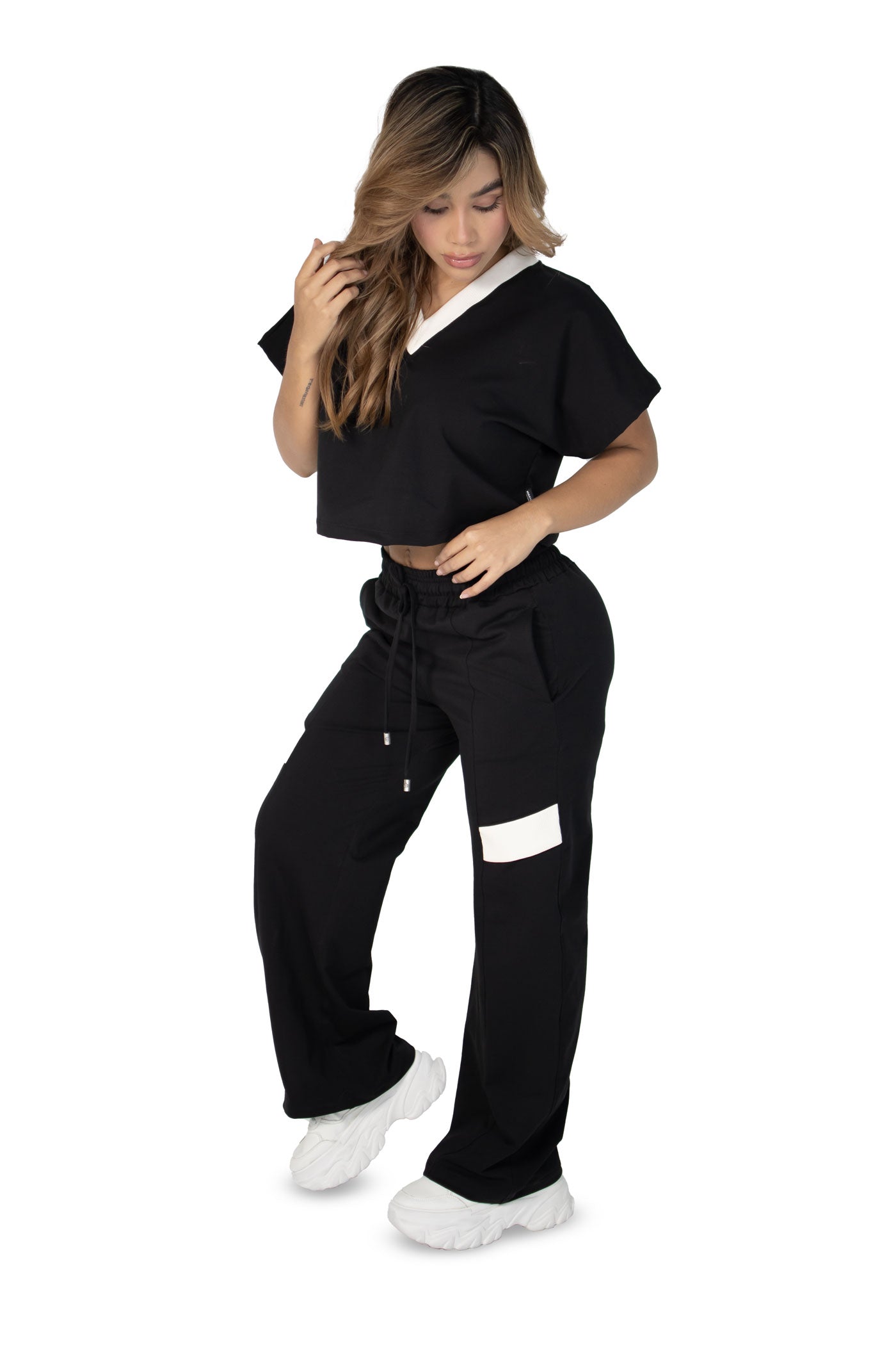 "El Vibe Free Set es una pieza esencial para mujeres que buscan comodidad sin perder el estilo urbano. La blusa semi oversize con cuello en V aporta frescura y libertad de movimiento, mientras que el pantalón sudadera de bota recta con líneas estilo alforza y la incrustación de tela en ambas piernas añade un detalle sofisticado y contemporáneo.