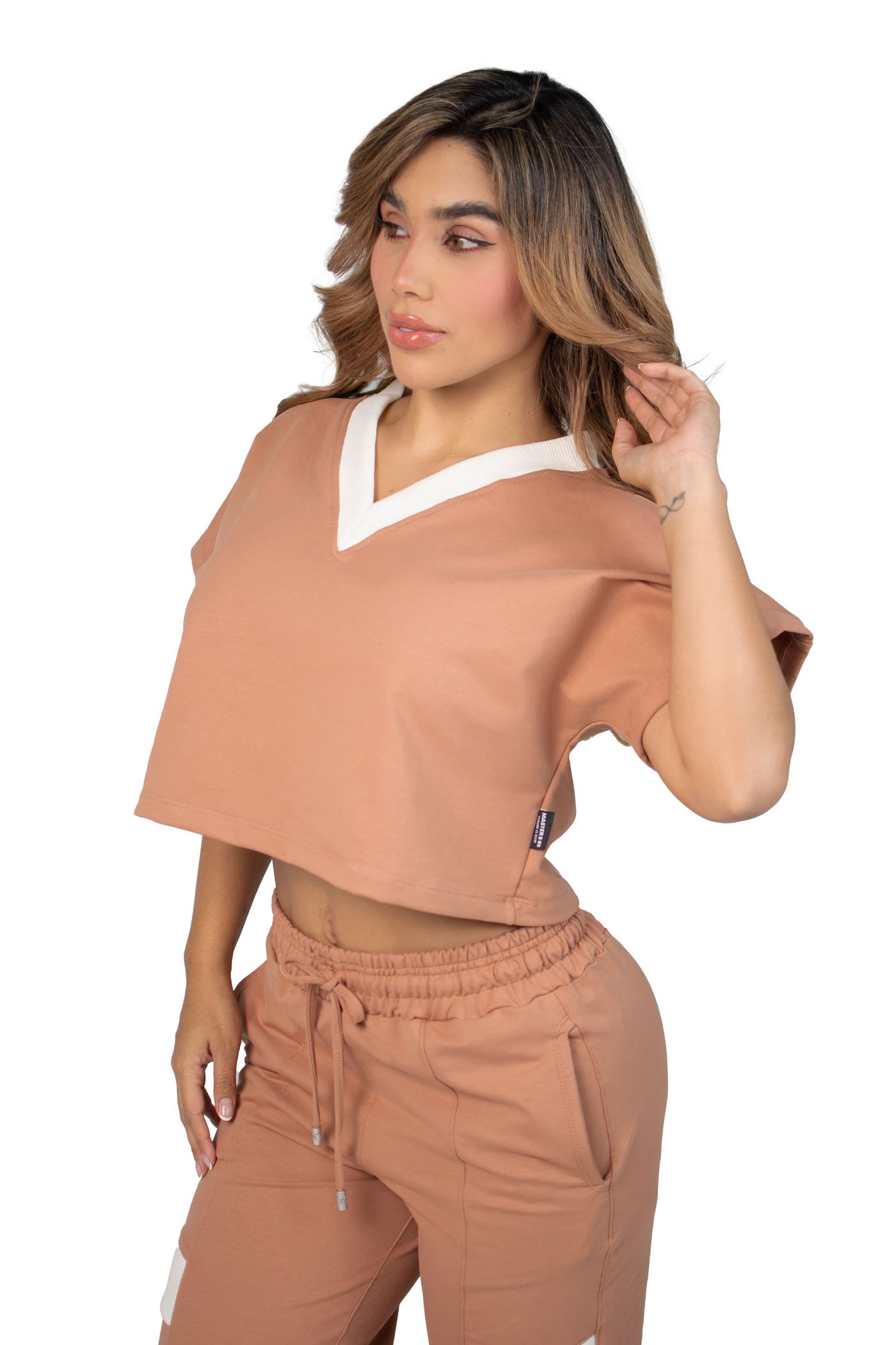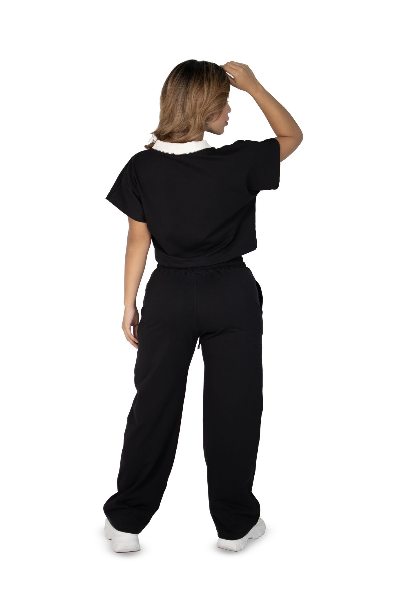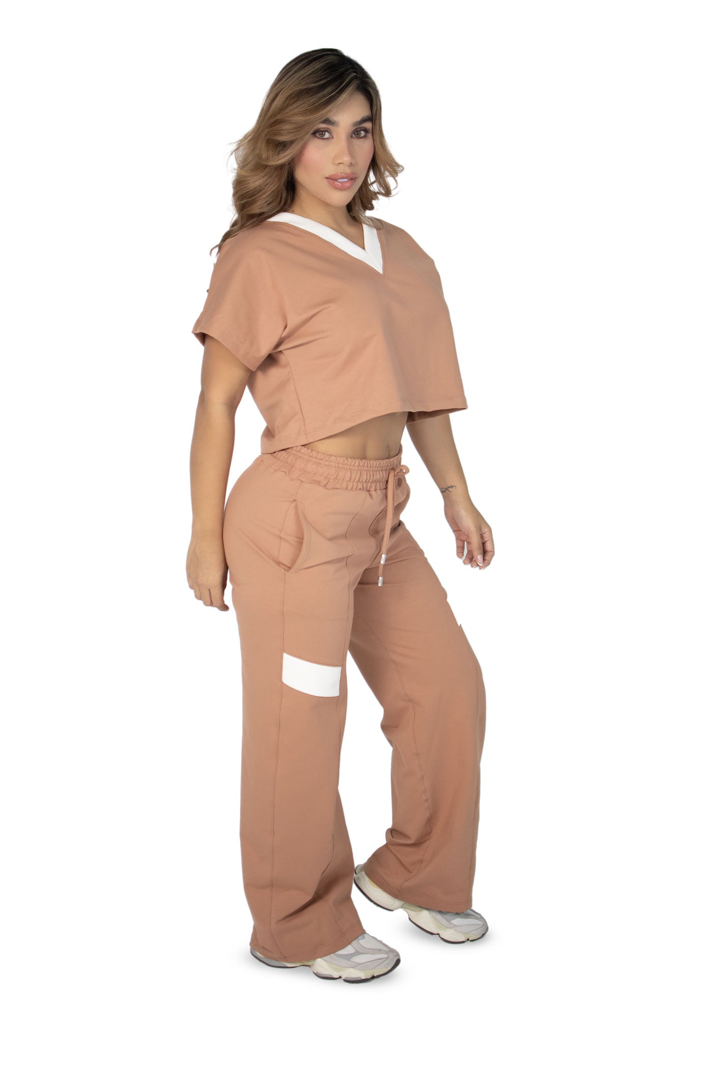 "El Vibe Free Set es una pieza esencial para mujeres que buscan comodidad sin perder el estilo urbano. La blusa semi oversize con cuello en V aporta frescura y libertad de movimiento, mientras que el pantalón sudadera de bota recta con líneas estilo alforza y la incrustación de tela en ambas piernas añade un detalle sofisticado y contemporáneo.
